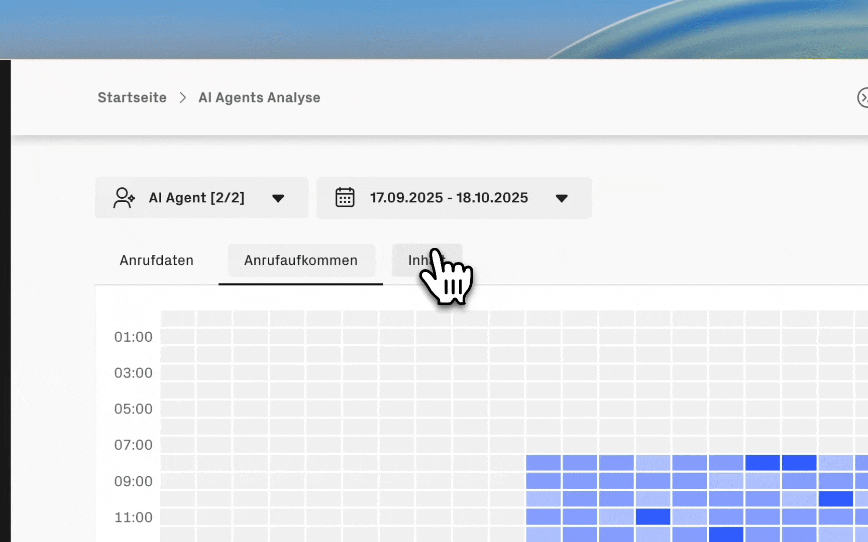 Im Bereich Analyse erhalten Sie einen Überblick darüber, wie Ihr Agent tatsächlich genutzt wird. Die Statistiken zeigen, wann Anrufe eingehen, welche Themen besprochen werden und wie sich die Nutzung über verschiedene Zeiträume entwickelt. So können Sie Ihren Agent gezielt optimieren, Kapazitäten anpassen oder Inhalte verbessern.