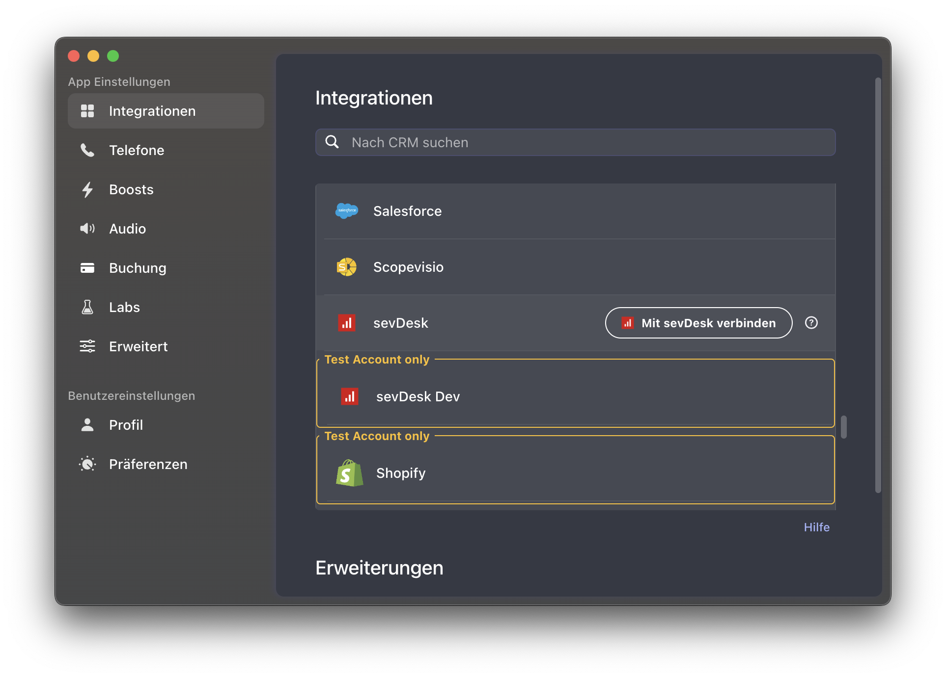 Unter dem Punkt Integrationen suchen Sie den Eintrag sevDesk und klicken auf die Schaltfläche Mit sevDesk verbinden.
