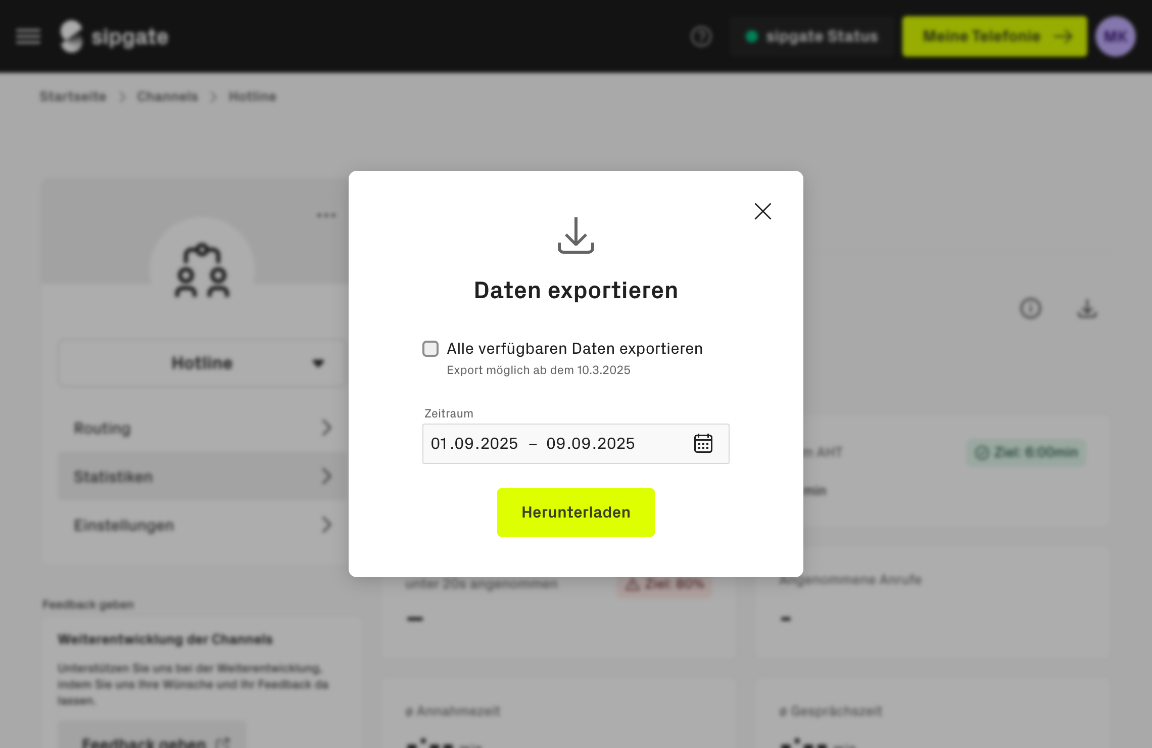 Als Admin haben Sie die Möglichkeit, die Erreichbarkeit der letzten 60 Tage für alle erstellen Channels separat statistisch auszuwerten. Hierfür wird eine automatische Statistik erstellt, die alle eingehenden Anrufe erfasst. Um sich die aktuelle Statistik herunterzuladen, gehen Sie im entsprechenden Channel-Routing links auf Datenexport. In neueren Verträgen ganz einfach unter dem Download-Button. Sie erhalten anschließend die gewünschte Datei im CSV-Format.