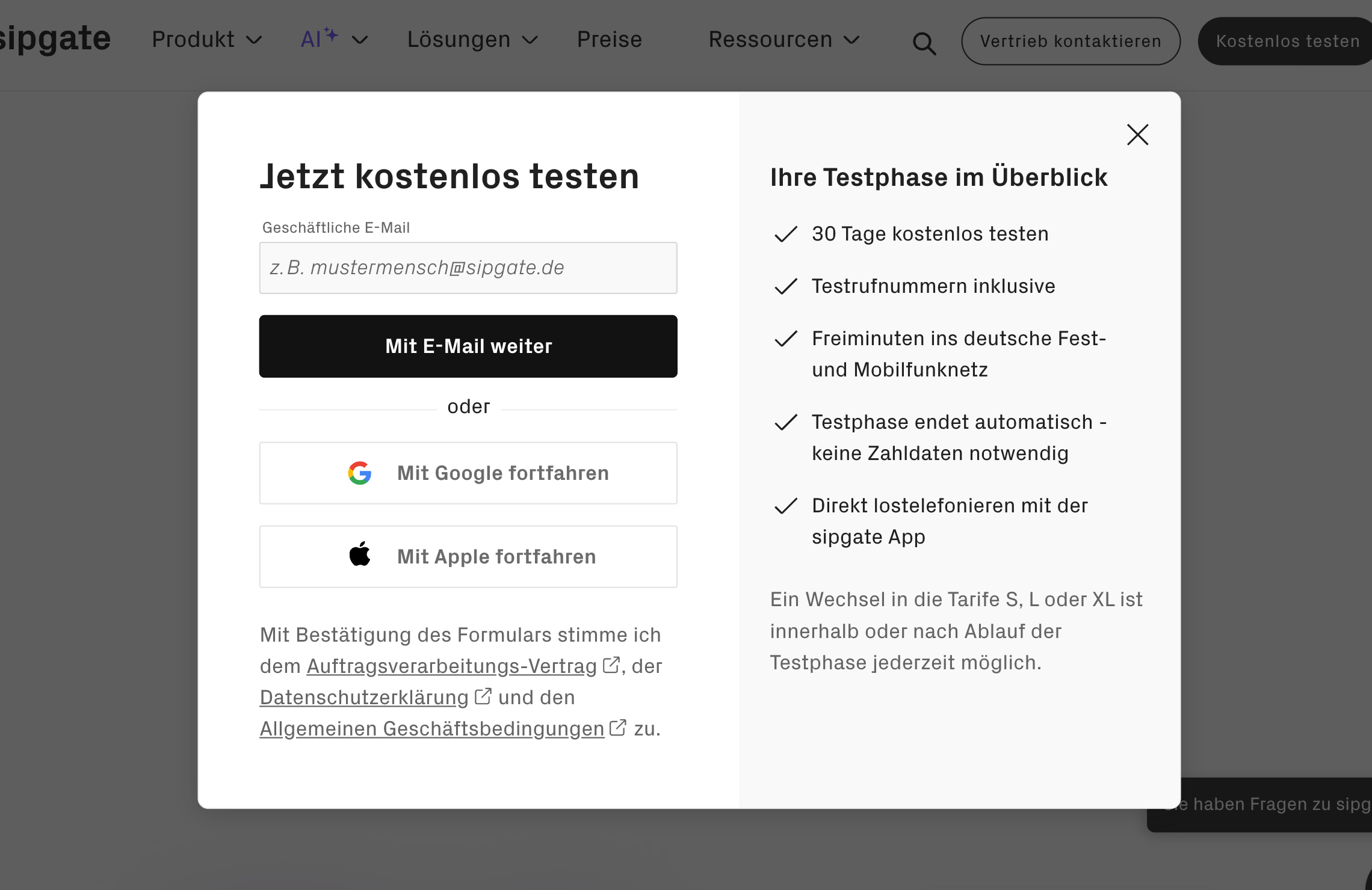 Sie haben die Möglichkeit, innerhalb der 30-tägigen Testphase sipgate kostenlos, vollumfänglich und ohne Angaben Ihrer Bankdaten auszuprobieren. In dieser Zeit erhalten Sie von uns einen Testrufnummernblock mit fünf Ortsrufnummern mit düsseldorfer Vorwahl. Sie müssen die Testphase nicht manuell kündigen. Die Testphase endet automatisch nach 30 Tagen. Wenn Sie während der 30 Tage in eine Vollversion wechseln, endet die Testphase ebenfalls automatisch.