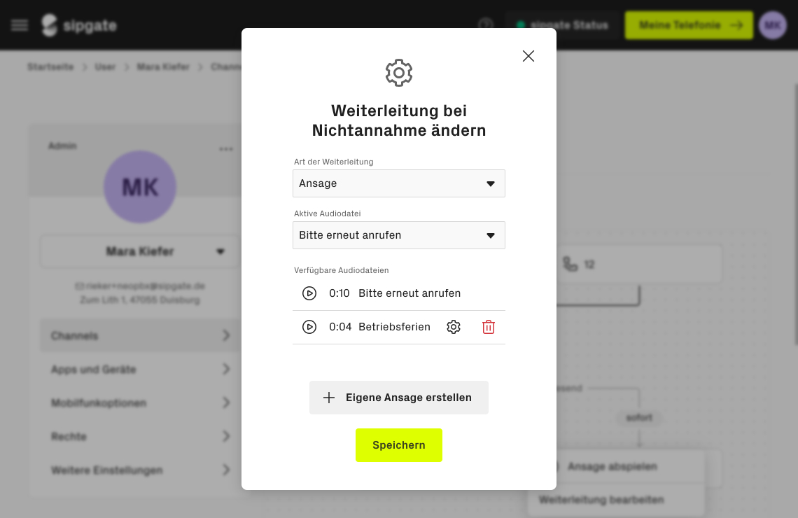 Hinweis: Es besteht auch die Möglichkeit die Ansage per Text-to-Speech zu nutzen. Dabei geben Sie einfach den gewünschten Text ein, der automatisch in Sprache umgewandelt wird. So können Anrufer:innen z. B. eine Information hören („Wir sind aktuell nicht erreichbar“) anstatt weitergeleitet zu werden.