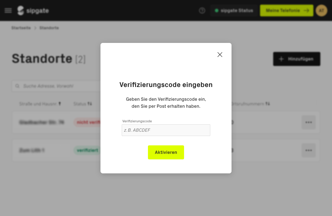 Bevor Sie mit sipgate telefonieren können, müssen Ihre Standorte verifiziert werden. Damit erfüllen wir die gesetzlichen Vorgaben der Bundesnetzagentur und stellen sicher, dass Rufnummern nicht missbraucht werden. Die Verifizierung ist einmalig notwendig und wird durch den/die Account-Administrator:in durchgeführt.