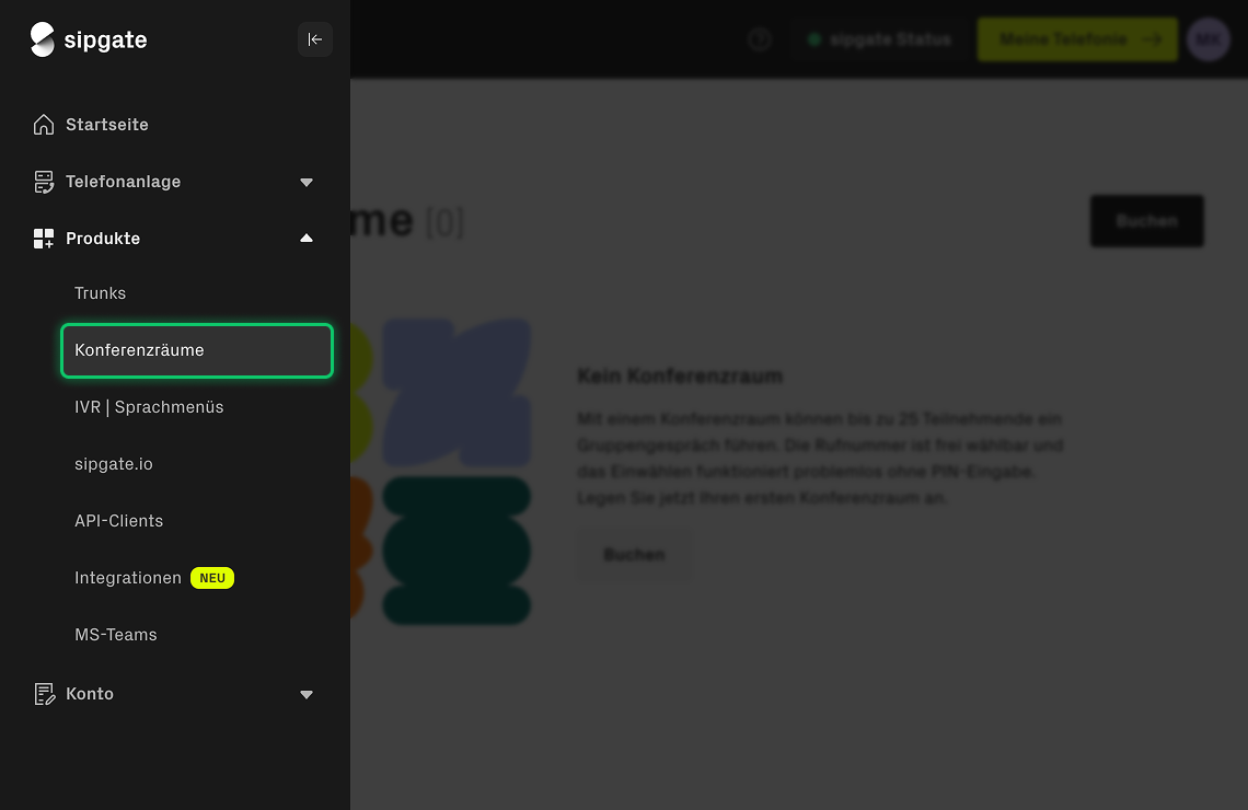 Den Konferenzraum buchen Sie in der Accountverwaltung unter Konferenzräume. Buchen Sie sich nun einen Konferenzraum.