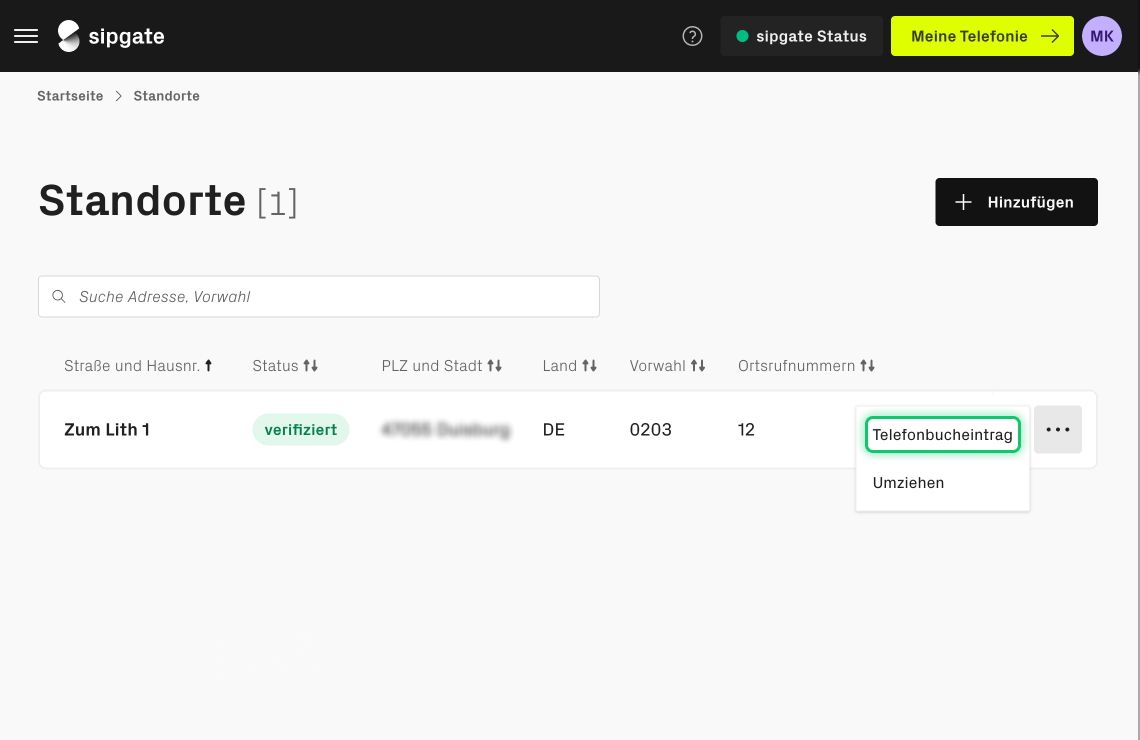Anschließend klicken Sie auf Telefonbucheintrag rechts neben dem gewünschten Standort.