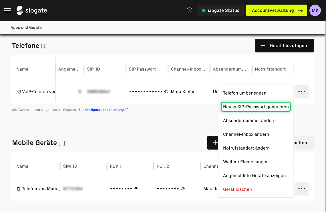 Wählen Sie die Option zum Generieren eines neuen SIP-Passworts.