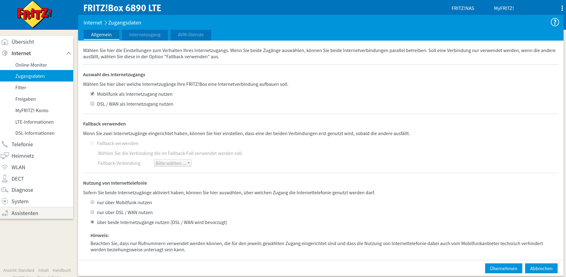 | Internet->Zugangsdaten->Internetzugang 2/2 | Internet->LTE Informationen ->Übersicht |