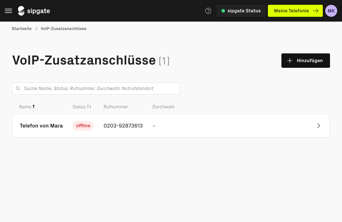 In der Accountverwaltung gehen Sie auf die Kachel VoIP-Zusatzanschlüsse. Klicken Sie anschließend auf den Button: + VoIP-Zusatzanschluss hinzufügen.