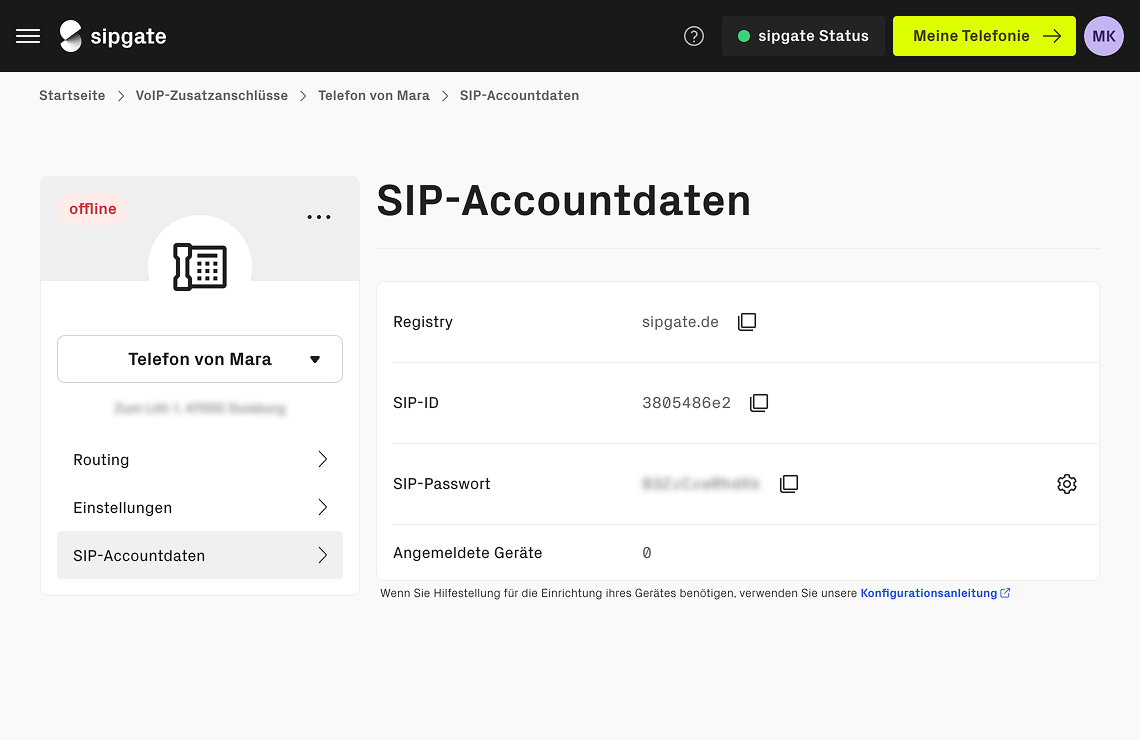 Klicken Sie nun mit der Maus auf den neuen Anschluss und gehen Sie auf SIP-Accountdaten. Hier finden Sie die Zugangsdaten, welche Sie in ein vorhandenes VoIP-Telefon eintragen können.