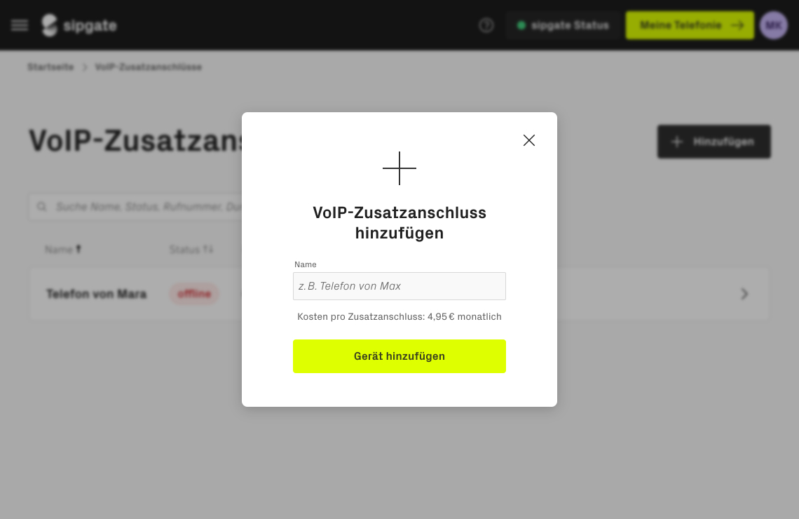 Geben Sie einen beliebigen Namen für den Anschluss ein und drücken Sie auf Gerät hinzufügen.