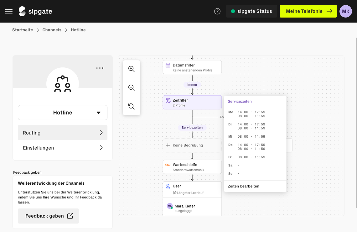 Mit zeitbasiertem Routing können Sie Ihre Erreichbarkeit an bestimmte Zeiten anpassen – z. B. Bürozeiten, Feierabend oder Pausen.