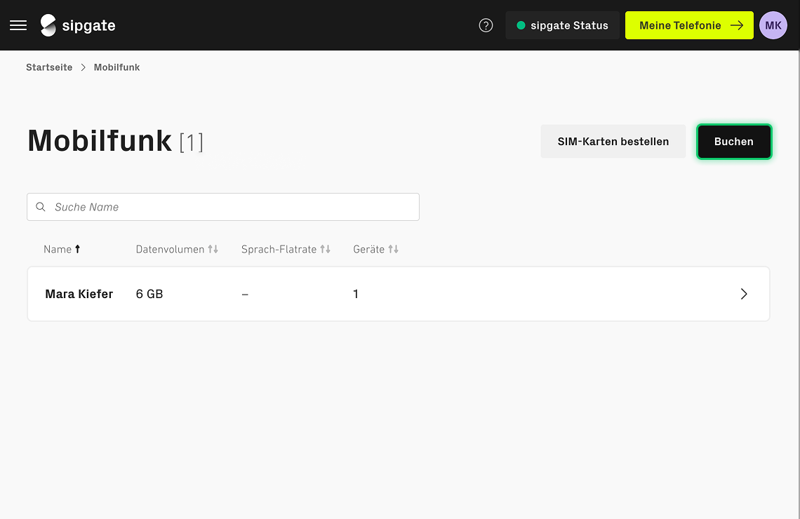 Hier können Sie bestehende Mobilfunkoptionen anpassen und neue Buchungen für User (Daten- und Sprachflatrates) durchführen. Zudem gibt es hier nähere Informationen zur Mobilfunknutzung der einzelnen User, wie beispielsweise zum gebuchten und verbleibenden Datenvolumen und den verbundenen Geräten. Weiterhin haben Sie hier als Admin die Möglichkeit, mobilen Zusatzanschluss zu buchen und zu bearbeiten sowie die wichtigsten Informationen über entsprechende Buchungen zu erfassen.
